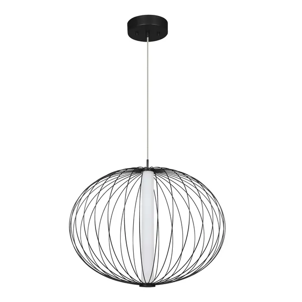 Rodzaj lampy: Mała lampa wisząca z kolekcji Treviso Wymiary: Wysokość 180 cm, średnica 40 cm Materiał i kolorystyka: Ażurowa konstrukcja wykonana z czarnego metalu Źródło światła: Zintegrowane źródło światła LED CCT o zmiennej barwie. Barwę ustawia się raz przed montażem w podsufitce lampy.