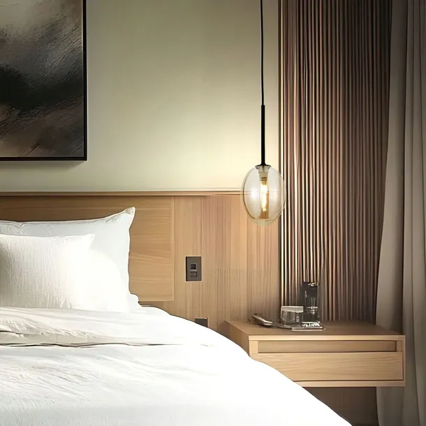 Minimalistyczna lampa wisząca z dekoracyjnym, szklanym kloszem to propozycja dla osób, które cenią elegancję i nastrojowe oświetlenie. Jej smukła, czarna konstrukcja doskonale kontrastuje z transparentnym kloszem w odcieniu koniaku, który subtelnie rozprasza światło i nadaje wnętrzu ciepły, przytulny charakter. Szklana forma delikatnie eksponuje źródło światła, tworząc efekt dekoracyjny i podkreślając styl aranżacji. Lampa świetnie sprawdzi się jako pojedynczy punkt nad stolikiem nocnym lub w kompozycji kilku lamp nad blatem czy wyspą kuchenną. Jej uniwersalny design pasuje zarówno do wnętrz nowoczesnych, loftowych, jak i bardziej klasycznych. Produkt sprzedawany jest bez żarówek.