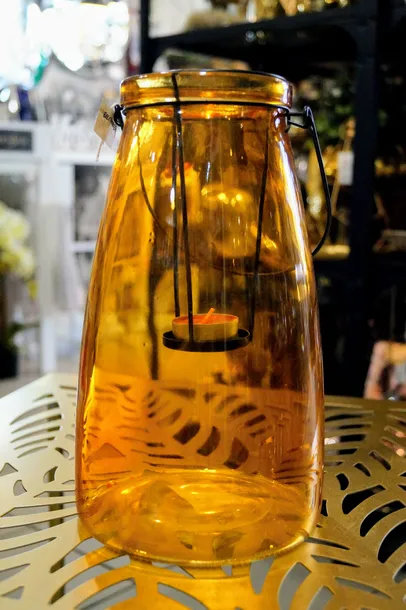 Prosty w formie lampion wykonany z pomarańczowego szkła oraz metalu.