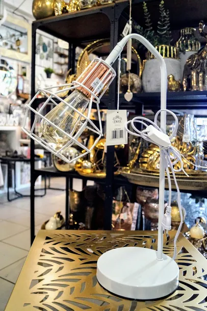 Lampka stołowa/nocna z dekoracyjną metalową podstawą. Idealnie wkomponuje się we wnętrze w stylu nowoczesne.