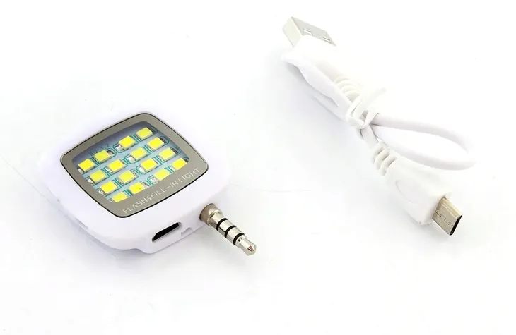 Wysokiej jakości lampa LED SELFIE do smartfona! Urządzenie zostało wyposażone w 16 diod doświetlających LED. Lampka komunikuje się z telefonem za pomocą wbudowanego wtyku miniJack 3,5 mm. Umożliwia dobre i równomierne doświetlenie wykonywanych telefonem zdjęć oraz nagrywanych filmików video. Sprawdzi się również doskonale jako latarka, która nie obciąża baterii telefonu dzięki wbudowanemu akumulatorkowi. Aby go naładować wystarczy użyć dołączonego w zestawie kabla microUSB. Urządzenie posiada również trójstopniową regulację jasności świecenia, co ułatwia dopasowanie siły światła do potrzeb użytkownika.