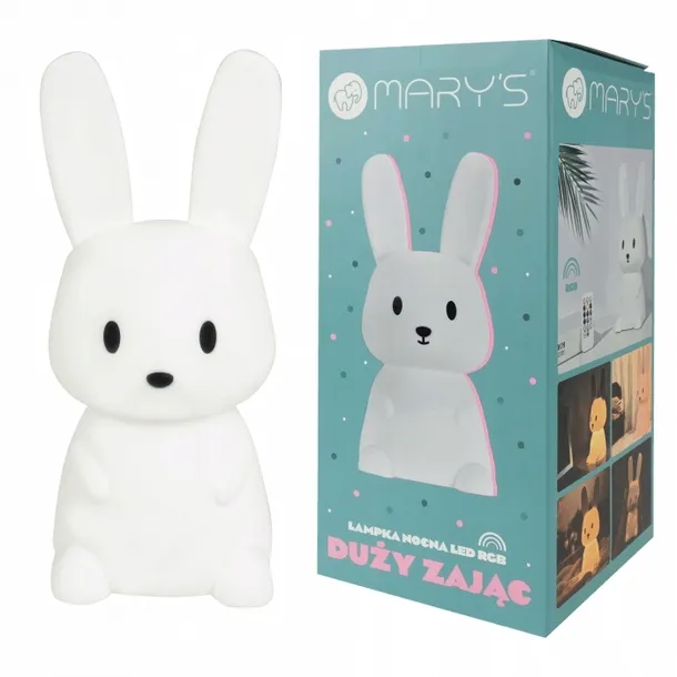 MARY'S LAMPKA LED ZAJĄC DUŻY BIAŁY RGB+WW +RC to elegancka i funkcjonalna lampka nocna, która łączy uroczy design z nowoczesną technologią oświetleniową. Idealna do sypialni dziecięcej, pokoju malucha lub jako dekoracyjny element w każdym wnętrzu, oferuje zarówno ciepłe światło, jak i funkcję zmiany kolorów RGB, co czyni ją wszechstronnym rozwiązaniem oświetleniowym.