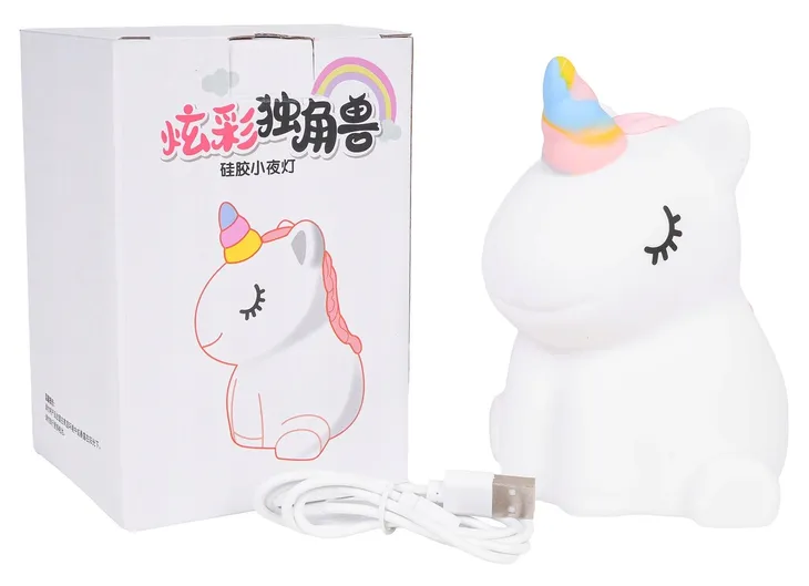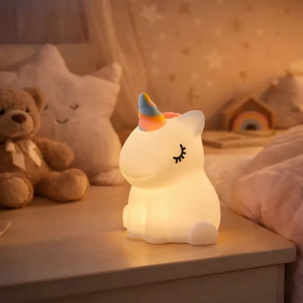 Lampka nocna w kształcie jednorożca przeznaczona dla dzieci od 3. roku życia. Wykonana z miękkiego, przyjemnego w dotyku silikonu wolnego od BPA. Emituje delikatne, ciepłe światło, które tworzy przytulne i bezpieczne otoczenie w pokoju dziecka.