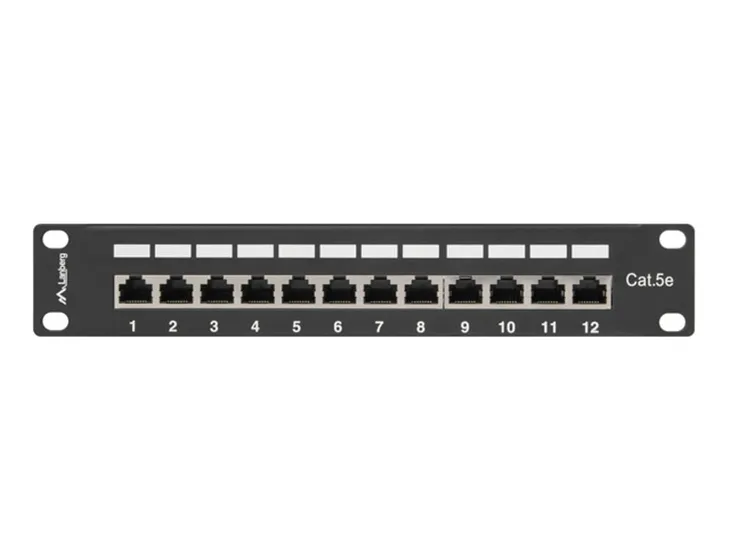 Lanberg PPF5-9012-B. Złącze(a): RJ-45, Obsługiwane typy kabli: Cat5, Cat5e. Kolor produktu: Czarny, Materiały: Metal, Typ montażu: Montaż półkowy. Certyfikaty: T568A/B. Szerokość produktu: 215 mm, Wysokość produktu: 44,5 mm, Głębokość produktu: 130 mm