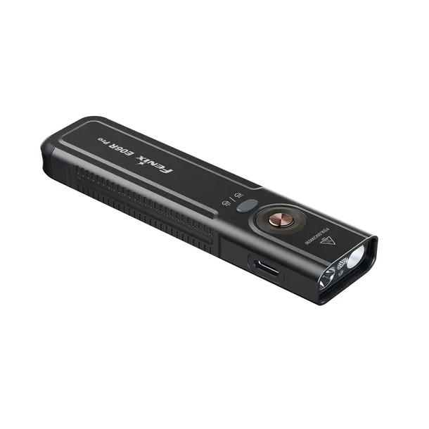 Obudowa Fenix E06R PRO została wykonana z anodowanego aluminium o wysokiej odporności na uderzenia. Model posiada płaski korpus o wymiarach 123 × 31 × 19 mm, co ułatwia przenoszenie w kieszeni oraz montaż przy pomocy klipsa 2-w-1. Latarka spełnia normę odporności IP66 i wytrzymuje upadki z wysokości do 1,5 m. Urządzeniem steruje się za pomocą dwóch przełączników: górny odpowiada za obsługę światła białego, a tylny za wybór trybów dodatkowych (UV, laser, efekty 3D). Każde źródło światła może być kontrolowane niezależnie, co pozwala na wykorzystanie urządzenia w różnych sytuacjach i scenariuszach.