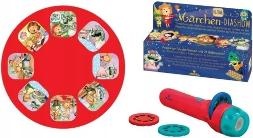 Latarka, Mini Projektor, Bajki od Moses to niezwykłe akcesorium, które wprowadzi Twoje dziecko w magiczny świat opowieści. Wyświetlając 24 kolorowe ilustracje z trzech klasycznych bajek: Czerwonego Kapturka, Jasia i Małgosi oraz Królewny Śnieżki, pobudza dziecięcą kreatywność i wyobraźnię, sprawiając, że czas przed snem staje się wyjątkowym przeżyciem.