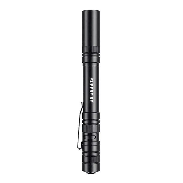 Kompaktowa latarka Superfire L28 może Ci towarzyszyć niemal wszędzie. Bez problemu zmieści się nawet w kieszeni, a dzięki jasności 121 lm i wodoodporności IP44 (International Protection 44, ochrona przed ciałami stałymi powyżej 1 mm i bryzgami wody z dowolnego kierunku) doskonale sprawdzi się w różnych zastosowaniach. Waży zaledwie 29 g, więc jest niemal nieodczuwalna w bagażu czy kieszeni, a jej minimalistyczny, stylowy design sprawia, że prezentuje się elegancko. Do zasilania urządzenia wystarczą łatwo wymienne 2 baterie AAA (potrójne A, standardowy rozmiar baterii), a jego czas pracy sięga 47 minut. Co więcej, produkt został wykonany z trwałego stopu aluminium – jest wyjątkowo wytrzymały i odporny na upadki oraz uszkodzenia.