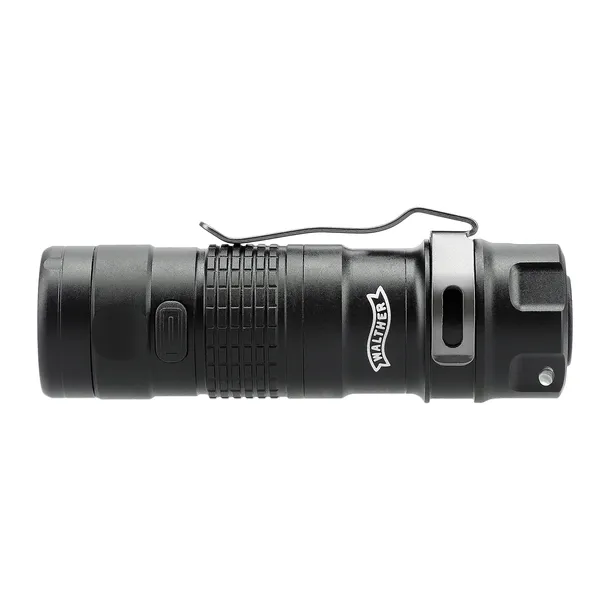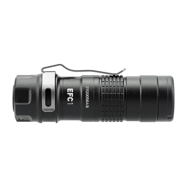 Kompaktowa i wszechstronna latarka Walther EFC1 o kieszonkowych wymiarach oferuje cztery poziomy jasności (5/50/200/400 lumenów) oraz tryby stroboskopowy i beacon (lampa błyskowa). Sterowanie odbywa się za pomocą tylnego włącznika, który umożliwia szybkie włączanie/wyłączanie i chwilowe światło, natomiast boczny przełącznik odpowiada za zmianę jasności i dostęp do trybów specjalnych. Lampa zapamiętuje ostatnio używany poziom jasności i uruchamia się na tym samym ustawieniu. Wbudowane ostrzeżenie informuje o spadku pojemności baterii poniżej 25%.