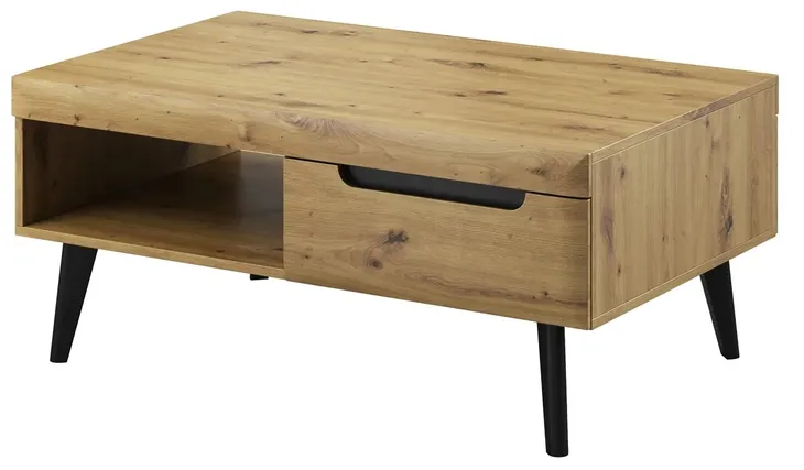 Ława cechuje się minimalistyczną formą i nowoczesnym designem, dzięki czemu sprawdzi się w każdym wnętrzu. Mebel posiada dwie szuflady, po przeciwnych stronach mebla, oraz praktyczną wnękę pod blatem. Korpus i blat mebla wykonano z płyty laminowanej, zaś fronty szuflad oraz umieszczone nad nimi listwy są z płyty MDF.