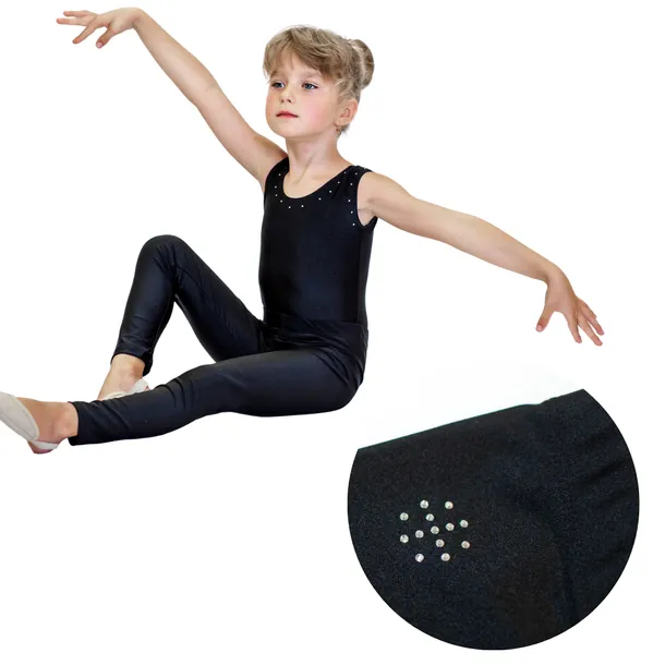 Twoje dziecko zaczyna przygodę z baletem, tańcem, akrobatyką lub gimnastyką, a Ty szukasz odpowiedniego stroju? Legginsy Odetta to idealny wybór dla młodych tancerek, które potrzebują komfortu, swobody ruchu i elegancji podczas zajęć. Sprawdzą się na lekcjach modern, jazz, baletu, gimnastyki, rytmiki czy akrobatyki, zarówno podczas treningów, jak i występów scenicznych. Płaski szew i brak klina zapewniają wygodę, a subtelny kryształowy wzór na prawym biodrze dodaje wyjątkowego stylu.