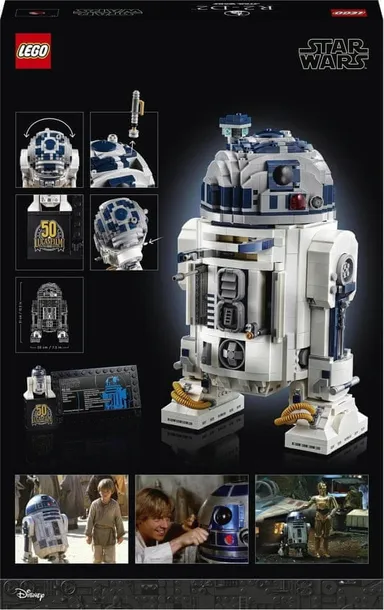- W komplecie jest zbudowana z klocków podstawka z plakietką informacyjną, figurka LEGO® Star Wars™ droida R2-D2 oraz specjalny klocek LEGO upamiętniający 50. rocznicę powstania wytwórni Lucasfilm.