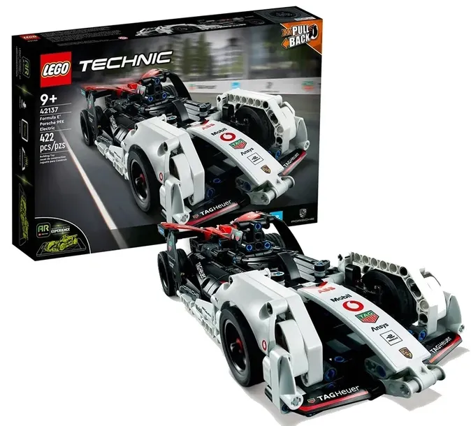 Zestaw LEGO® Technic Formula E® Porsche 99X Electric (42137) z napędem typu pull-back to najlepszy zestaw dla miłośników Formuły E® i samochodów Porsche w wieku od 9 lat. Dzieci mogą zbudować fascynujący model ze wszystkimi detalami samochodu wyścigowego Porsche, a potem wziąć udział w realistycznym wyścigu za pomocą dwóch silników typu pull-back i aplikacji LEGO Technic AR.