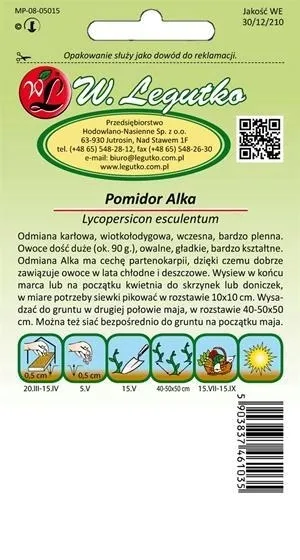 Pomidor Alka należy do wyjątkowo plennych warzyw o dość soczystym i smacznym miąższu o mocno krwistym kolorze. Zawiera dużo witamin i minerałów takich jak: witaminy C, B1,B2,B3,B6, potas, magnez, wapń i wiele innych. Wysiew przypada na miesiące wczesnej wiosny marzec, kwiecień. Sadzić do skrzyń, doniczek, na paletach, pod osłonami.W drugiej połowie wiosny przesadzić do gruntu w miejsca słoneczne. Cieszyć się jej pysznym smakiem możemy w miesiącach letnich i jesiennych a