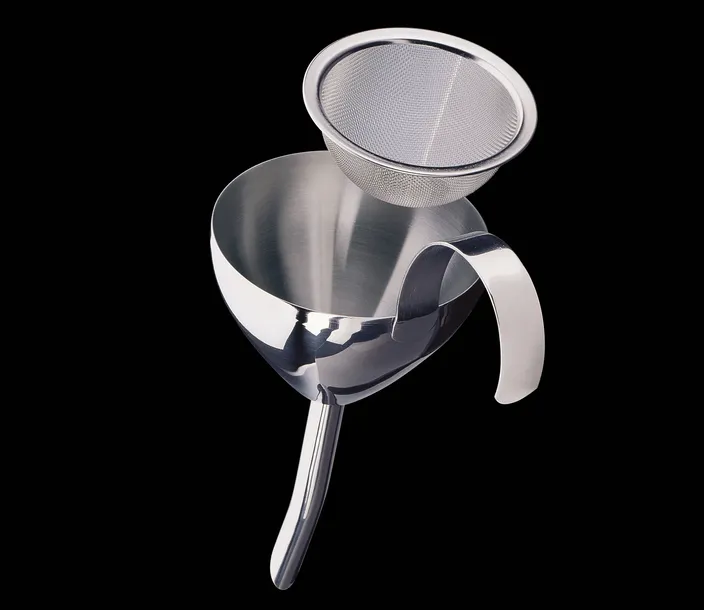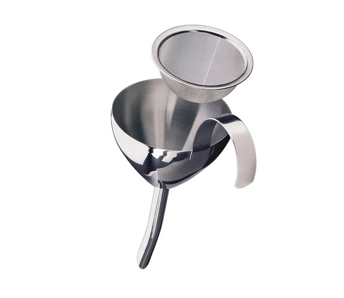 Posiada wyjmowane sitko oraz uchwyt do trzymania lub powieszenia lejka.