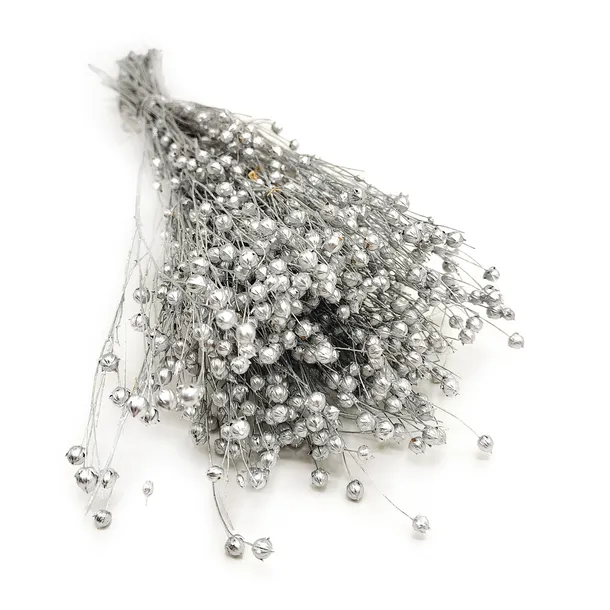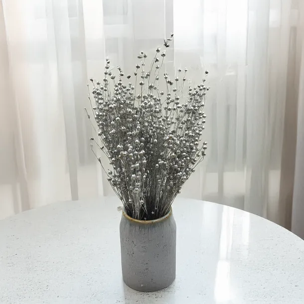 Len suszony barwiony na kolor srebrny to unikatowa dekoracja łącząca naturalną strukturę rośliny z nowoczesnym, metalicznym blaskiem. Doskonale pasuje do aranżacji w stylu glamour, nowoczesnym i minimalistycznym, wprowadzając subtelny, luksusowy akcent.