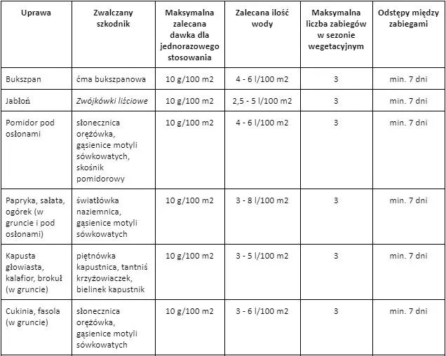 Insektycyd przeznaczony do biologicznego zwalczania gąsienic motyli. Środek w postaci proszku do sporządzania zawiesiny wodnej, do nalistnego stosowania. Zawiera naturalnie występującą na roślinach oraz w glebie bakterię Bacillus thuringiensis, wytwarzającą krystaliczne białka, które aktywowane są w przewodzie pokarmowym gąsienic.