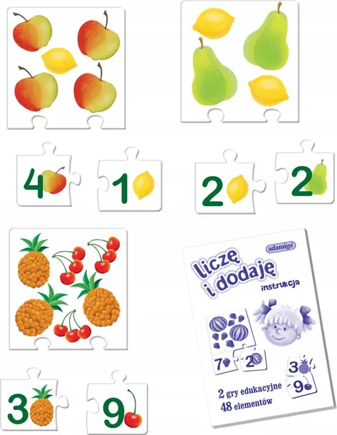 Układanka Liczę i dodaję składa się z 48 puzzli, z których można ułożyć 16 kompletów. Na każdy z nich składa się duży puzzel z obrazkiem dwóch rodzajów owoców oraz dwa mniejsze z cyframi i owocami, które odpowiadają liczbie owoców z dużego puzzla. W środku pudełka znajduje się instrukcja z opisem dwóch można również wykorzystać jako układankę podczas zabawy z jednym dzieckiem.