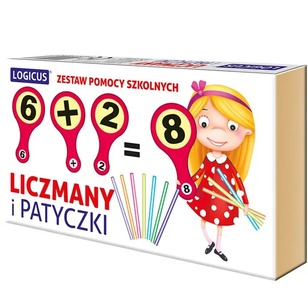 Zestaw zawiera plakietki z cyferkami i działaniami matematycznymi oraz patyczki do liczenia.