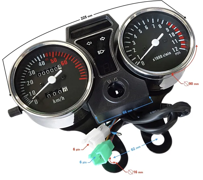 - funkcje: prędkościomierz, obrotomierz, licznik km dzienny i całkowity, kontrolki kierunkowskazów i świateł drogowych, wyświetlacz biegów