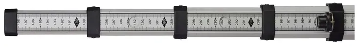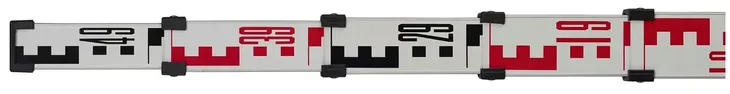 Teleskopowa łata niwelacyjna 5 m, z aluminium. Z podziałką E po jednej stronie i podziałką milimetrową po drugiej. Każdy człon przy pełnym wyciągnięciu zatrzaskuje się. Wyposażona w okrągłą libellę i futerał ochronny.
