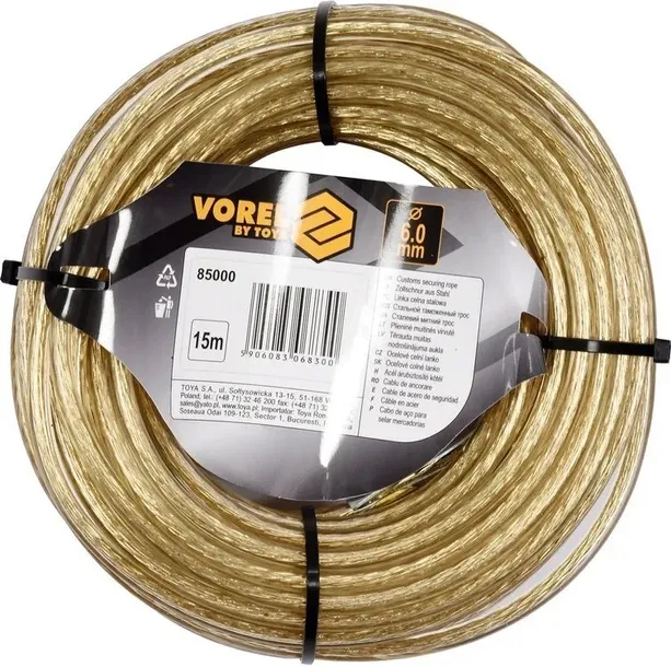 Wytrzymała, stalowa linka celna marki Vorel o długości 15 metrów, pokryta przezroczystą osłoną z PCV. Przeznaczona do skutecznego zamykania i plombowania skrzyń ładunkowych. Zakute metalowe końcówki ułatwiają szybki montaż plomby.