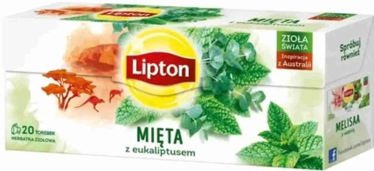 Inspiracja z Australii Mięta z eukaliptusem Australia to ojczyzna eukaliptusa - wiecznie zielone drzewa i krzewy stały się już symbolem tego kraju i inspiracją dla intrygującej kompozycji smakowej. W herbatce Lipton eukaliptus stworzył aromatyczną kompozycję z miętą pieprzową, która tradycyjnie uważana jest za zioło o właściwościach ułatwiających trawienie. Efekt? Cudownie pachnąca filiżanka pełna smaku i aromatu! Rozkoszuj się smakiem naszej herbatki jako doskonałym uzupełnieniem urozmaiconej i zbilansowanej diety oraz zdrowego trybu życia. Naturalnie nie zawiera kofeiny tak jak inne dostępne herbatki owocowe i ziołowe. Zioła w 100% uprawiane z poszanowaniem natury.