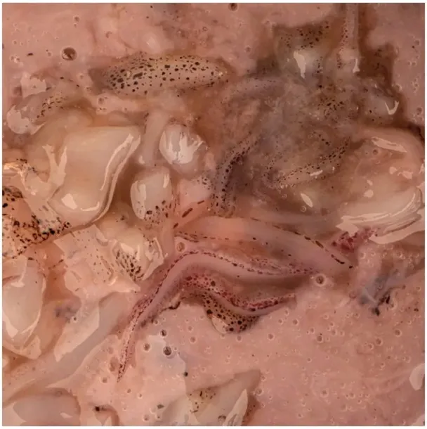 - Jego główny składnik to blendowana kałamarnica atlantycka