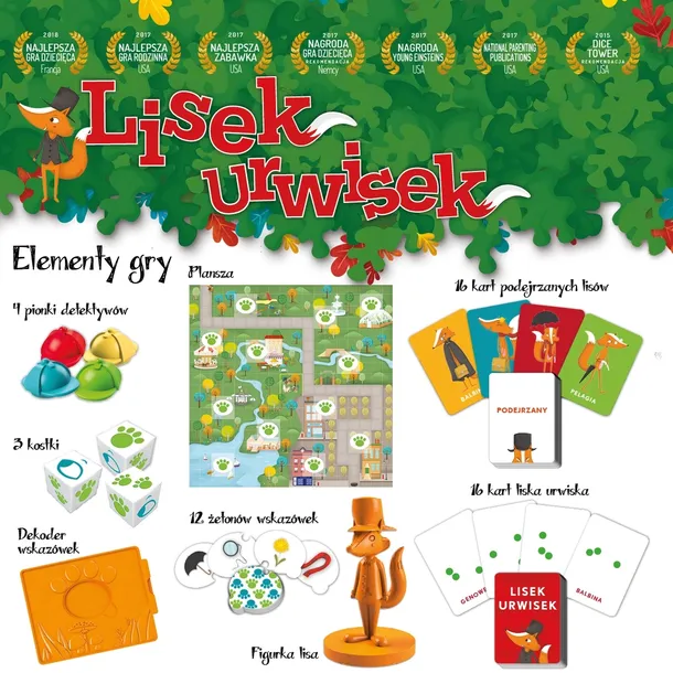 Gra detektywistyczna dla dzieci! Gra kooperacyjna, w której dzieci nie rywalizują ze sobą. Zbierają wskazówki pozwalające rozwiązać zagadkę. Wśród lisów ukrył się lisek urwisek – gracze muszą współpracować, aby go odnaleźć. Gra posiada wyjątkowe elementy gry: specjalne kostki ze śladami lisa, pionki detektywów oraz detektor – specjalny sprzęt detektywa pozwalający zidentyfikować poszukiwanego lisa! Zdobyte nagrody: • Najlepsza Gra Dziecięca – nominacja (Polska, 2020), • Najlepsza Gra Dziecięca (Francja, 2018), • Najlepsza Gra Rodzinna (USA, 2017), • Najlepsza Zabawka (USA, 2017), • Najlepsza Gra Dziecięca – rekomendacja (Niemcy, 2017), • Nagroda „Młody Einstein” (USA, 2017), • Nagroda Rodziców (USA, 2017), • Rekomendacja „Dice Tower” (USA, 2015).