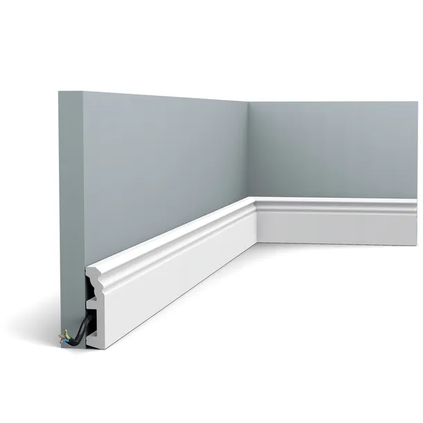 Listwa przypodłogowa SX195 z podwójnym przetłoczeniem w górnej części. Listwa wysokości 8 cm. Z miejscem na zagospodarowanie kabli. Elegancka, do klasycznych pomieszczeń.