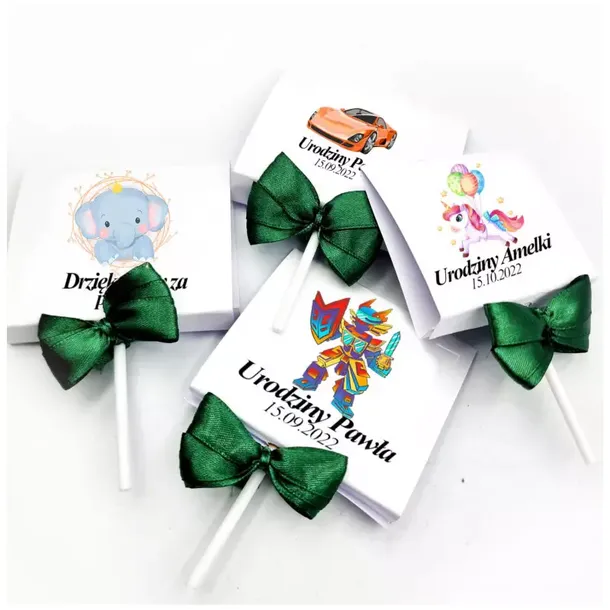 Organizujesz urodziny swojej pociechy? Poszukujesz drobnych upominków dla dzieci? Oto i one! Lizak owocowy w pięknej otoczce z tasiemką. Cena za 1 szt gotowego produktu - lizak + otoczka +wstążka Minimalna liść zamówienia 10 szt!!! (poniżej 10 szt lizaki są traktowane jako próbki i zostaną wysłane z losową grafiką bez personalizacji) Realizacja zamówienia następuje po akceptacji projektu Wysyła EXPRESOWA realizacja w 2 dni robocze = usługa dodatkowo płatna + 100% CENY CZAS REALIZACJI 4-7 dni roboczych w zależności od ilości zamówień Do wyboru kolor wstążki: Biały Czarny Szary Czerwony Różowy Butelkowa zieleń Niebieski Przy zakupie proszę podać w wiadomości dla sprzedającego: wzór lizaka (jeśli nie będzie podany automatycznie wykonuję losowo) imię (jeżeli dotyczy) data (nie musi być daty na projekcie) kolor wstążki ( w przypadku braku tej informacji automatycznie wykonuje białą) Ważne: wysokość kartonika 6 cm szerokość kartonika 6,5 cm termin przydatności: 9 miesięcy od zakupu skład lizaka podany na opakowaniu lizaki wysyłane są losowo waga lizaka: 8g Uwaga!!! Staramy się jak najlepiej odwzorować kolorystykę produktu. Zastrzegamy sobie jednak możliwość różnic kolorystycznych wynikająca z różnych ustawień monitorów i ekranów telefonicznych.
