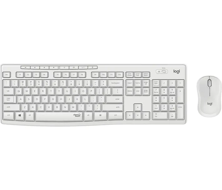 Logitech MK295 Silent. Rozmiar klawiatury: Pełnowymiarowy (100%). Styl klawiatury: Prosty. Technologia łączności: Przewodowa, Interfejs urządzenia: USB, Układ klawiatury: QWERTY, Rekomendowane użycie: Biuro. Kolor produktu: Biały. Dołączona myszka