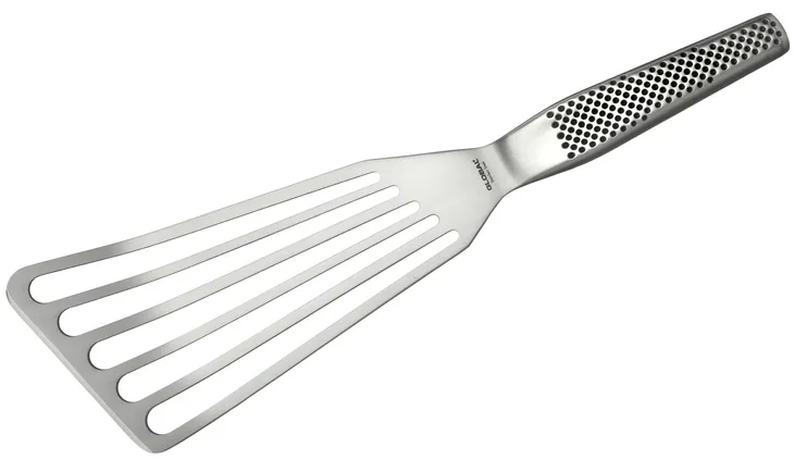 Szeroka łopatka cedzakowa to wszechstronne narzędzie do przewracania delikatnych potraw i odsączania ich z nadmiaru płynu. Znakomicie się sprawdza podczas przyrządzania ryb, jaj w koszulkach czy omletów. Łopatka Global jest cienka, elastyczna i lekko zaostrzona, więc można ją gładko wsunąć np. Została wyprofilowana w taki sposób, żeby ułatwić przenoszenie szerszych elementów. Fakturowana rękojeść nie wyślizguje się z rąk.