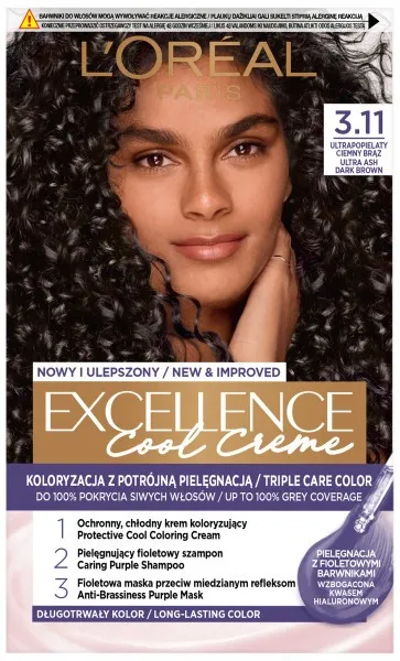 Koloryzacja z potrójną pielęgnacją teraz wzmocniona fioletową technologią przeciwko miedzianym refleksom, aby zapewnić odcienie, które pozostają chłodne na dłużej. Do 100% pokrycia siwych włosów.