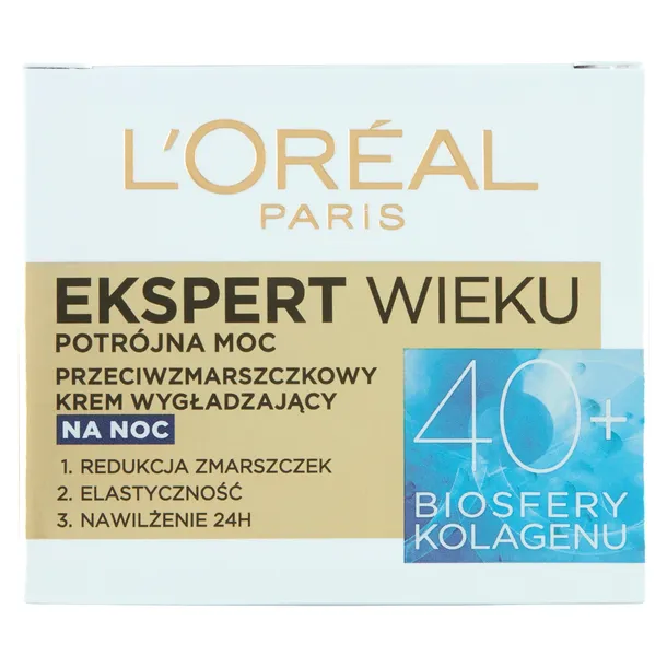 Z upływem czasu zmieniają się potrzeby skóry w zakresie pielęgnacji przeciwzmarszczkowej. L'Oreal Paris stworzyło linię kosmetyków Ekspert Wieku, ukierunkowaną na szczególne potrzeby skóry w każdym wieku. Po 40. roku życia spadek poziomu kolagenu w skórze może spowodować utratę sprężystości. Zaczynają się pojawiać drobne linie i zmarszczki. Do walki z danymi oznakami starzenia eksperci L'Oreal Paris stworzyli przeciwzmarszczkowy krem wygładzający na noc Ekspert Wieku 40+ o potrójnej mocy. Krem redukuje zmarszczki, uelastycznia skórę i nawilża przez 24 godziny. Krem wzbogacono o Biosfery Kolagenu opracowane, aby pomóc skórze zachować jej jędrność, Biosfery kolagenu przenikają przez górne warstwy naskórka i 9-krotnie zwiększają swoją objętość, aby wypełnić bruzdy zmarszczek.