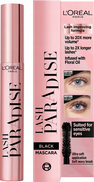 Mascara Lash Paradise daje efekt zwielokrotnionej objętości i wydłużenia rzęs, a jego formuła wzbogacona o wyciągi kwiatowe daje efekt delikatnych i odczuwalnie miękkich rzęs. Przyjemnie gładka formuła przypominająca balsam łatwo się rozprowadza i zapewnia szybką aplikację. Jest również odpowiednia dla oczu wrażliwych i osób noszących soczewki.