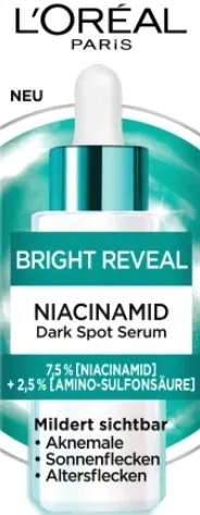 Bright Reveal Serum redukujące przebarwienia na dzień i na noc od L’Oréal Paris z 10% kompleksem niacynamidu i kwasu amino-sulfonowego, widocznie redukuje przebarwienia: potrądzikowe, posłoneczne, związane z wiekiem. Już po tygodniu stosowania serum skóra jest bardziej rozświetlona oraz widocznie znikają wszystkie rodzaje przebarwień.