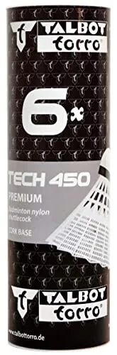 The Tech 450 from the famous german-british brand Talbot-Torro is a high-quality and durable tournament, nylon shuttlecock with cork base. It is particularly suitable for ambitious recreational sports and for training. The plumage is made of 100% pure nylon material, without any "cheap" recycled material. Due to the pure nylon, the plumage is much smoother and more elastic; it is thus more durable and does not break so fast. The head of the shuttlecock is made of 100% pure cork => better flight characteristics and higher durability. There are 6 balls each in a box, with some available variants: Yellow plumage or white plumage and 3 speeds per plumage color. Red speed: FAST Blue Speed: MEDIUM (the allround talent) Green speed: SLOW The speed can be seen by the corresponding color marking on the shuttlecock head, in wich there is a colored belt attached. The german-british brand Talbot-Torro was founded by the British badminton champion Derek Talbot, who after his playing days were over, was very committed into making badminton Olympic. Talbot-Torro is today the clear market leader in the leisure badminton segment in Central Europe and offers an excellent price-performance ratio.