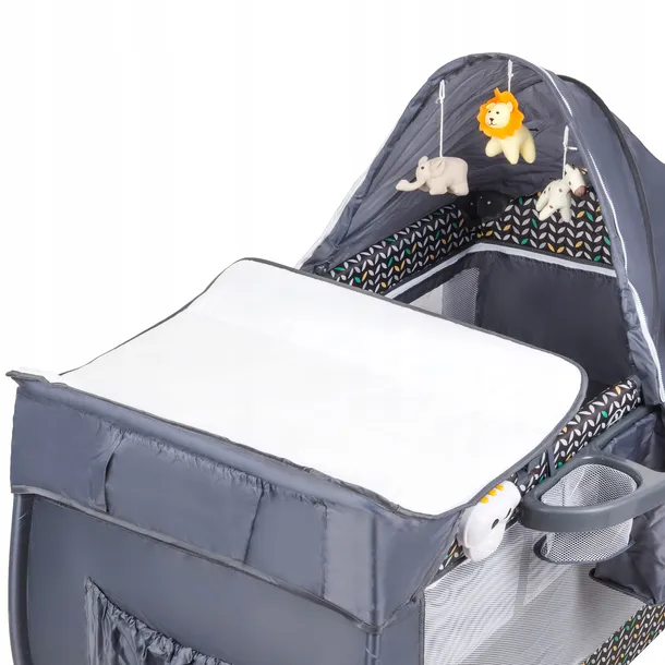 Łóżeczko turystyczne składane z bogatym zestawem dodatków oraz regulacją wysokości