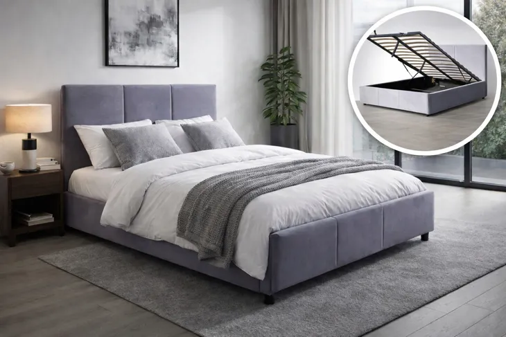 Łóżko posiada podnośniki gazowe, które ułatwiają podnoszenie stelaża i dostęp do pojemnika na pościel.