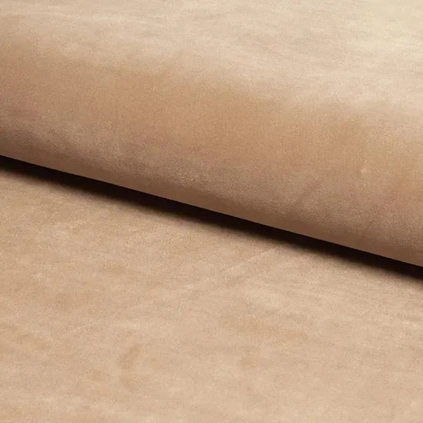 - łóżko tapicerowane tkaniną aksamitną w kolorze beżowym,