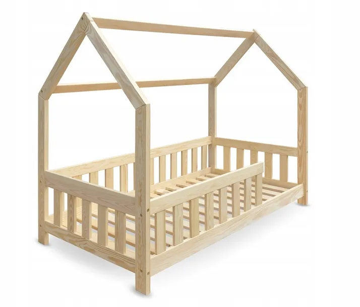 To łóżko domek Nielakierowane w rozmiarze 80x160 cm, wykonane z wysuszonego drewna sosnowego, wyróżnia się precyzyjnym wykonaniem – struganym czterostronnie i szlifowanym, co zapewnia gładką powierzchnię i wyjątkową trwałość na lata. Zaokrąglone krawędzie oraz fazowane końce eliminują wszelkie ostre elementy, gwarantując pełen komfort i spokój podczas codziennego użytkowania.