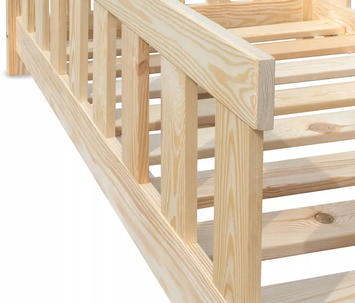 To łóżko domek Nielakierowane w rozmiarze 80x160 cm, wykonane z wysuszonego drewna sosnowego, wyróżnia się precyzyjnym wykonaniem – struganym czterostronnie i szlifowanym, co zapewnia gładką powierzchnię i wyjątkową trwałość na lata. Zaokrąglone krawędzie oraz fazowane końce eliminują wszelkie ostre elementy, gwarantując pełen komfort i spokój podczas codziennego użytkowania.