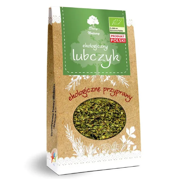 SKŁADNIKIlubczyk liść* 100 % (*certyfikowany składnik ekologiczny)OPIS Przyprawia się nim potrawy z fasoli, zupy jarzynowe, kartoflankę, rosoły, poprawia zapach mięsa, potraw rybnych i sosów.ZALECANE WARUNKI PRZECHOWYWANIA Przechowywać w suchym miejscu.