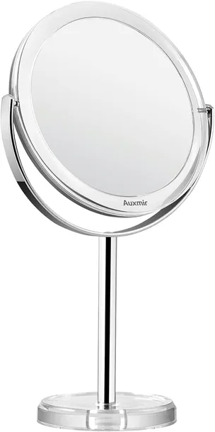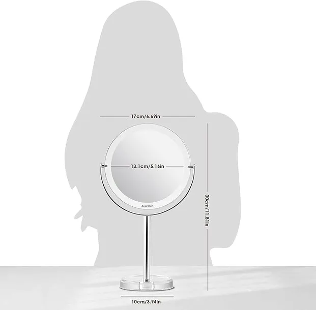 Powiększenie 10x/1X Auxmir Dwustronne lusterko do makijażu ma wspólne lustro i lustro powiększające 10x po drugiej stronie. Spełnia potrzeby codziennego użytku, zapewniając jednocześnie więcej szczegółów podczas makijażu, przycinania brwi i pielęgnacji twarzy. Należy pamiętać, że podczas korzystania ze strony lustra 10x należy zachować bardzo małą odległość (w granicach 10 cm) pomiędzy lustrem, aby uzyskać wyraźny obraz powiększone odbicie. Nie jest to wada produktu, ale normalne zjawisko fizyczne występujące w przypadku zwierciadeł wklęsłych.