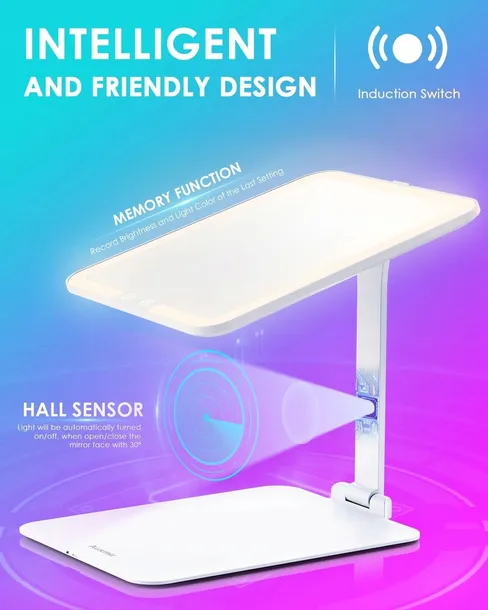 Lusterko LED do makijażu jest wyposażone w inteligentny czujnik Halla, dzięki czemu światło włącza się automatycznie po rozłożeniu.