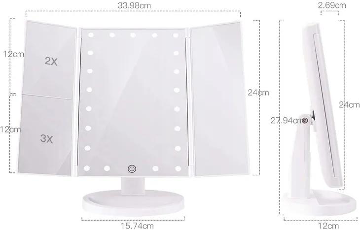 Powiększenie 1X / 2X / 3X: 2 boczne lusterka powiększające i szeroki kąt widzenia, dzięki czemu możesz wyraźnie zobaczyć rysy twarzy za pomocą tego lusterka kosmetycznego, gdy nakładasz drobne szczegóły makijażu, takie jak kredka do oczu, konturówka do ust i cień do powiek.