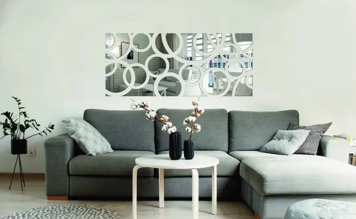 Produkt wykonany jest z wysokiej jakości pleksi lustrzanej o grubości 3 mm, dzięki czemu jest lekki, nietłukący i bezpieczny, a jednocześnie zapewnia odbicie zbliżone do tradycyjnego lustra szklanego. Do zestawu dołączony jest szablon montażowy, który ułatwia ułożenie wszystkich kół w równych odstępach.