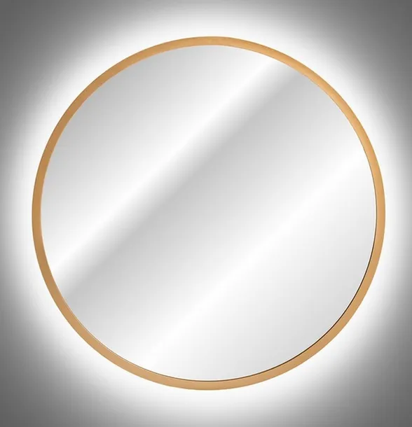 Lustro wiszące, okrągłe, LED, Hestia, 80 cm, złoty. Optymalnych rozmiarów lustro w nowoczesnym stylu, które łatwo dopasuje się do różnych stylów wnętrza. Lustro świetnie wygląda zawieszone nad innymi meblami, np. szafką pod umywalkę.