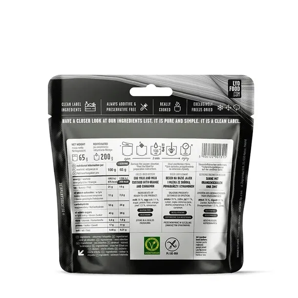 Wyprodukowana przez polska firmę Lyofood specjalizującą się w produkcji liofilizat - deser, krem kataloński z serii wegetariańskiej, bezglutenowej, 200 g.