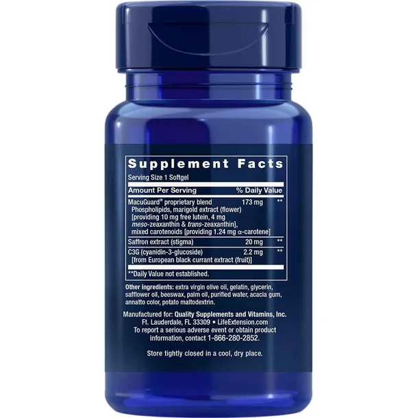 Zastrzeżona mieszanka MacuGuard (Fosfolipidy, ekstrakt z aksamitki (kwiat), dostarcza 10 mg wolnej luteiny, 4 mg mezo-zeaksantyny i trans-zeaksantyny), mieszane kartoneidy (dostarczają 1.24 mg alfa-kartoneidy)), Ekstrakt szafranowy (słupek), C3G (cyjanidyno-3-glukozyd) (z ekstraktu z owocu czarnej porzeczki), Oliwa z oliwek extra virgin, żelatyna, nośniki: gliceryna, olej z krokosza barwierskiego, wosk pszczeli, olej palmowy, woda oczyszczona, substancja wypełniająca: celuloza, barwnik: annato, maltodekstryna ziemniaczana.